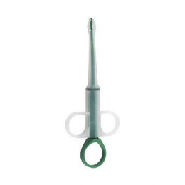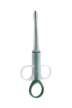Použití podavače: Mezi koncové čelisti zasuňte podávanou tabletu, uchopte podavač tak, abyste měli palec připraven v zeleném držadle pístu. Podavač vsuňte do tlamy zvířete až ke kořeni jazyka. Pístem uvolněte tabletu a zvířeti rychle zavřete a mírně zakloňte hlavu, aby bylo nuceno polknout.