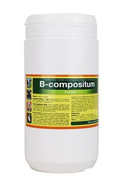 Vitamin B1, Vitamin B2, Vitamin B6, Vitamin B12, Niacinamid, Pantotenan vápenatý, Biotin, Inositol. Krmný návod: Doplňkové krmivo B-compositum se používá při výskytu poruch vyplývajících z nedostatku vitaminů skupiny B, poruchy kůže, opeření a srsti, nervové soustavy, při anémii, perosis, při zátěži vznikající v období intenzivního růstu, vysoké užitkovosti i jiném stresu. Velmi vhodné je jeho používání u zvířat v reprodukci ( zlepšení reprodukčních schopností zvířat, snížení embryonální úmrtnosti, dále pro dobrý vývoj plodu a zlepšení následné životaschopnosti mláďat ), u drůbeže ve snášce, u mláďat, v rekonvalescenci, po léčbě antibiotiky, sulfonamidy a antikokcidiky.