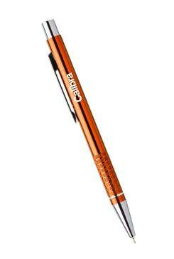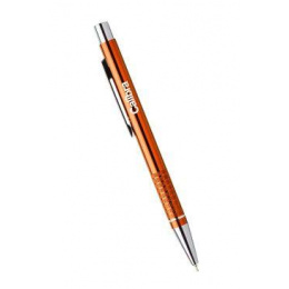 Kovová kuličková propiska s chromovými doplňky (špička, tlačítko, spona). Náplň pera je modrá, gelová.