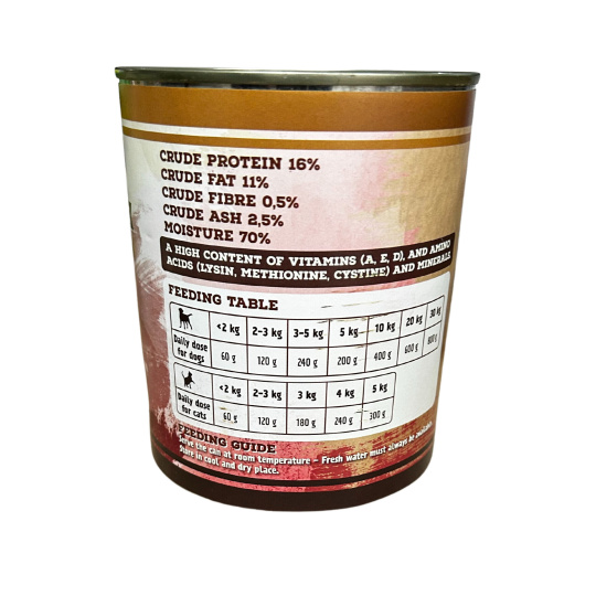 Bielkoviny 16% , Tuky 11%, Vláknina 0,5% Popol 2,5%, Vlhkosť 70%