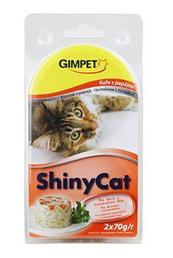Shiny Cat – lahůdkové, čistě masové konzervy – pouze přírodní, směs kuřete s papájou. V konzervě je vidět najemno nakrájené kuřecí maso a papája, bez umělých přísad a konzervačních látek.