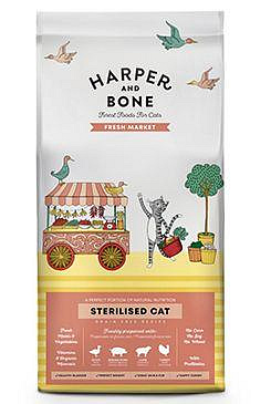 Harper and Bone Cat Sterilised čerstvé z trhu složené pouze z nejkvalitnějších surovin s vysokým podílem masa, přídavkem superpotravin a čerstvé zeleniny, zaručující prospěšné živiny a přirozenou chuť pro dokonale vyváženou výživu.