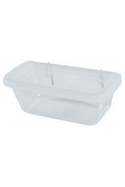 Transparentní krmítko s dělící mřížkou na zavěšení do klece pro ptáky.