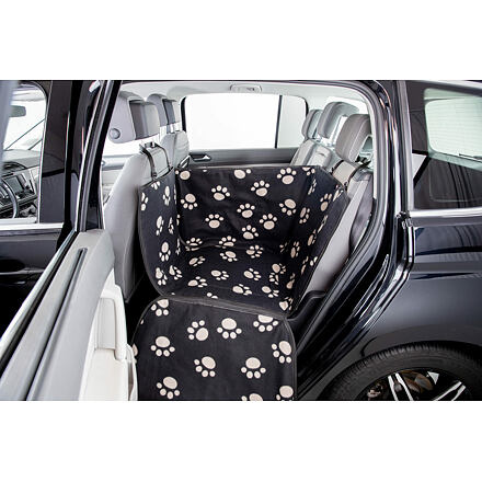 na zadní sedadlo ochraňuje proti špíně a zvířecím chlupům otvory na pásy umožňují připoutání psa klapky pro boční uchycení plastové disky na gumě umožňují lepší upevnění mezi sedadlo a opěradlo s reflexními pásky snadné upevnění a odstranění materiál: polyester rozměry: 1,45 x 1,60 m barva: černá