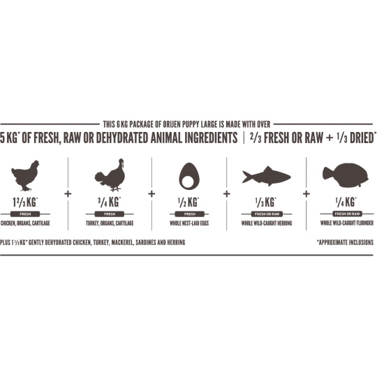 Orijen Dog Puppy Large je plný živočíšnych proteínov z voľne chovaných kurčiat a moriek, rýb lovených v prírodných vodách a vajec z hniezdnych chovov. Všetky suroviny sú dodávané čerstvé v bohato výživnom podielu celej koristi. So zníženým obsahom sacharidu a nízku glykemickú záťažou zaistí krmiva správny vývoj všetkých šteniat veľkých plemien.