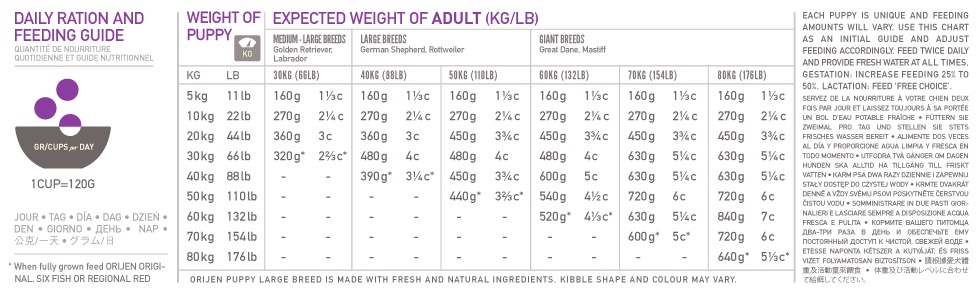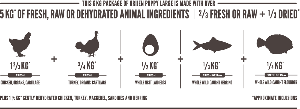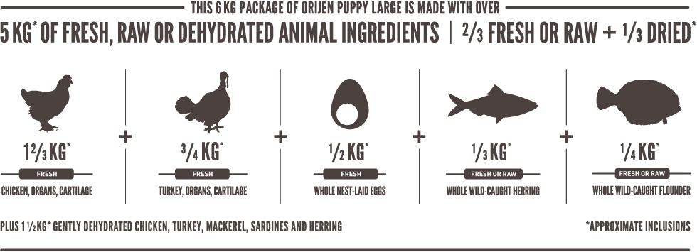 Orijen Dog Puppy Large je plný živočíšnych proteínov z voľne chovaných kurčiat a moriek, rýb lovených v prírodných vodách a vajec z hniezdnych chovov. Všetky suroviny sú dodávané čerstvé v bohato výživnom podielu celej koristi. So zníženým obsahom sacharidu a nízku glykemickú záťažou zaistí krmiva správny vývoj všetkých šteniat veľkých plemien.