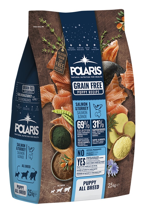 Vykostený losos (25%), zemiakové vločky (18%), sušené bravčové mäso (17%), sušená morka (15%), hrach (12%), hydinový tuk, zemiakový škrob, sušená repná drť (4%), hydrolyzovaná živočíšna bielkovina, kvasnice (3%), vitamíny a minerály, lososový olej (0,5%), psyllium (0,5%), extrakt z yuccy schidigera (0,2%), spirulina (0,2%), ActiveMOS (0,2%), MACROGARD (0,1%), rakytník (0,1%), bylinky (rozmarín, tymián, petržlen, 0,1%), chondroitín sulfát (270 mg/kg), glukosamín sulfát (200 mg/kg).