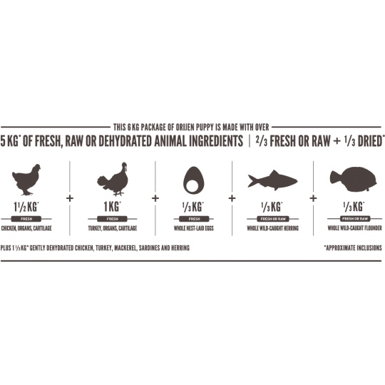 Orijen vyniká vysokým obsahom proteínov z voľne chovaných kurčiat a moriek, rýb lovených v prírodných vodách a vajec z hniezdnych chovov, to všetko je nám dodávané čerstvé v bohato výživnom podielu celej koristi . Plné živín, ktoré podporujú vrcholovú kondíciu a správny vývoj, vaše šteňa bude zdravé, spokojné a silné. Odporúčame predovšetkým pre viac aktívny šteňatá malých a stredne veľkých plemien.