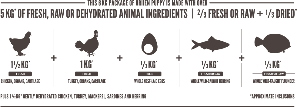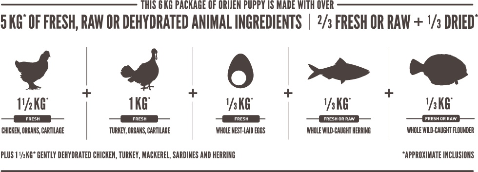 Orijen vyniká vysokým obsahom proteínov z voľne chovaných kurčiat a moriek, rýb lovených v prírodných vodách a vajec z hniezdnych chovov, to všetko je nám dodávané čerstvé v bohato výživnom podielu celej koristi . Plné živín, ktoré podporujú vrcholovú kondíciu a správny vývoj, vaše šteňa bude zdravé, spokojné a silné. Odporúčame predovšetkým pre viac aktívny šteňatá malých a stredne veľkých plemien.